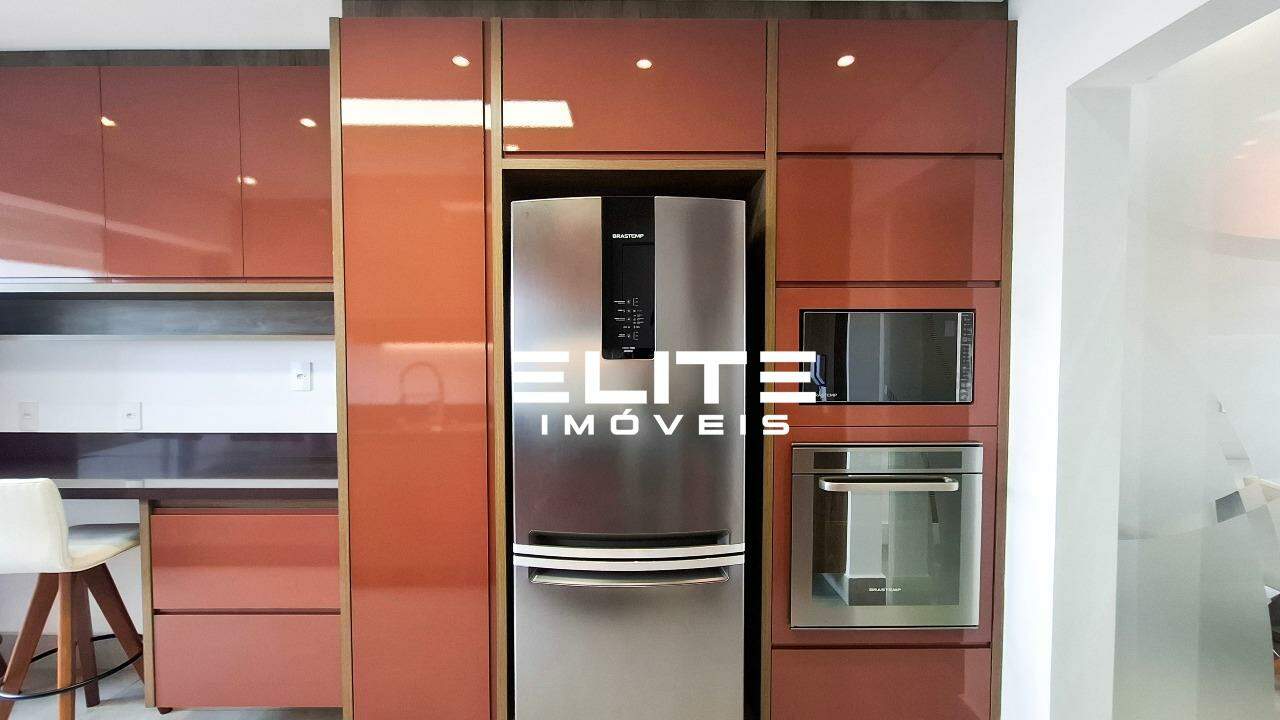 Cozinha planejada, equipada com fogão, micro-ondas, forno elétrico e geladeira