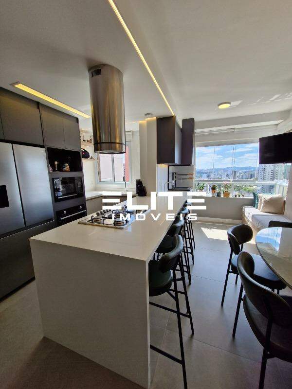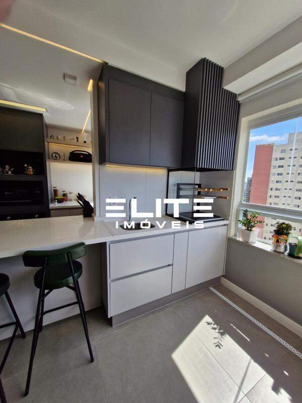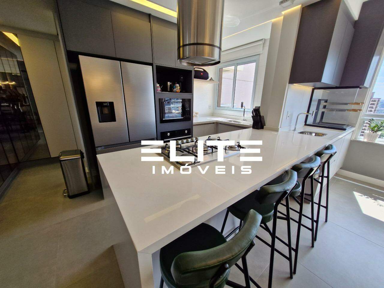 Cozinha planejada com torre quente e bancada em quartzo branco prime