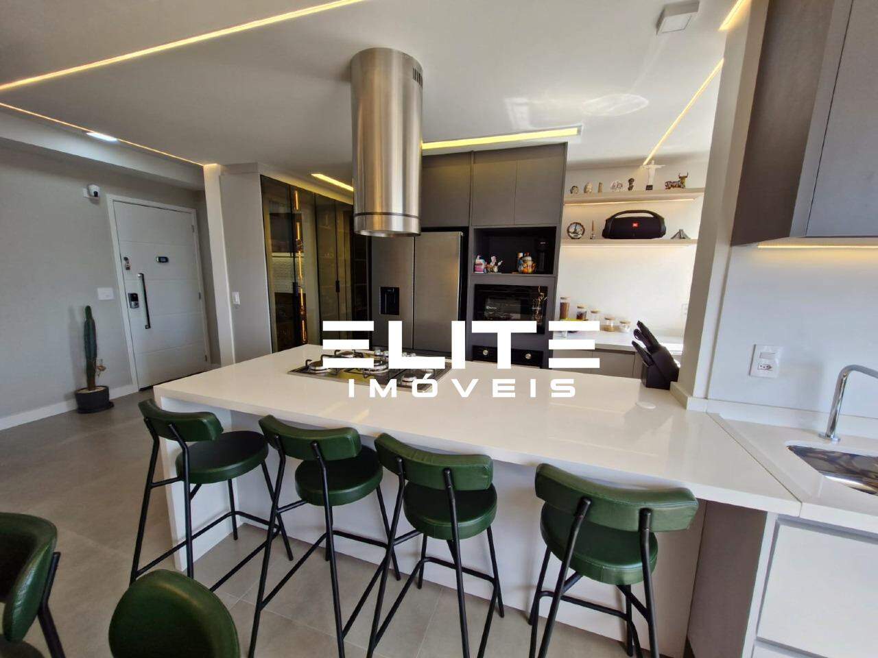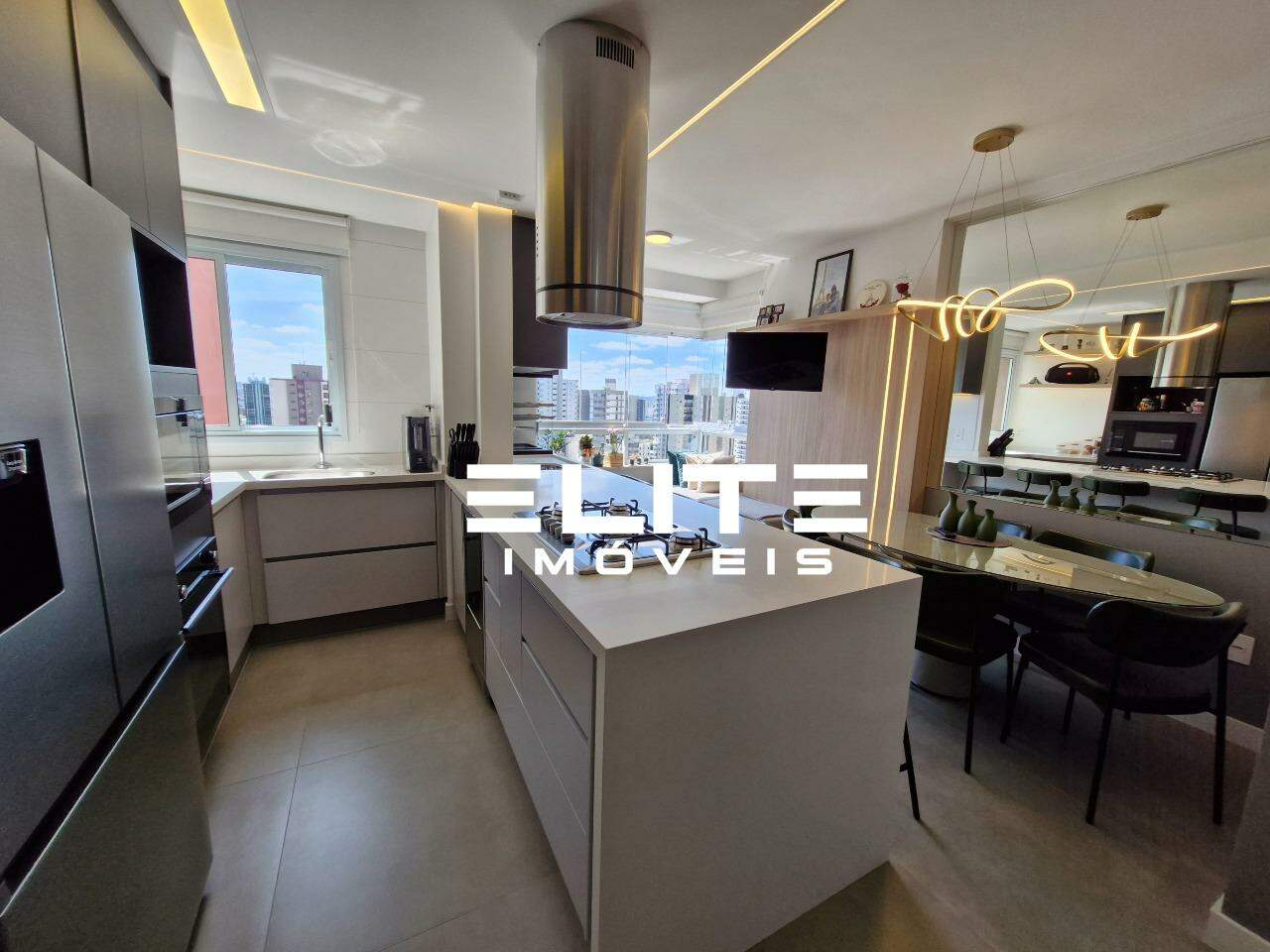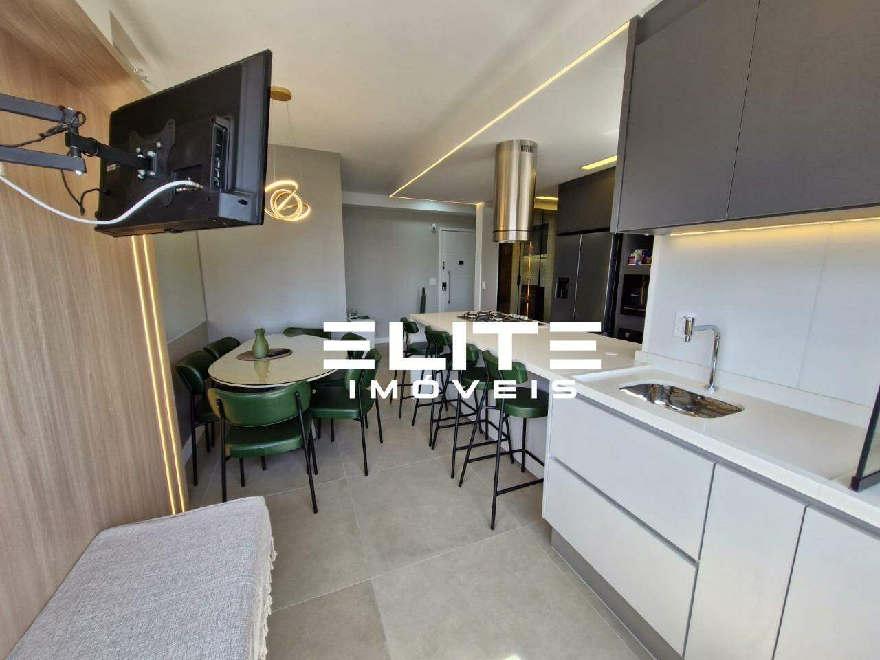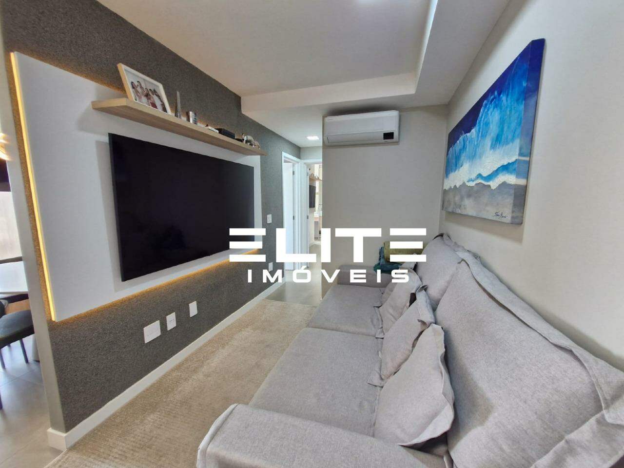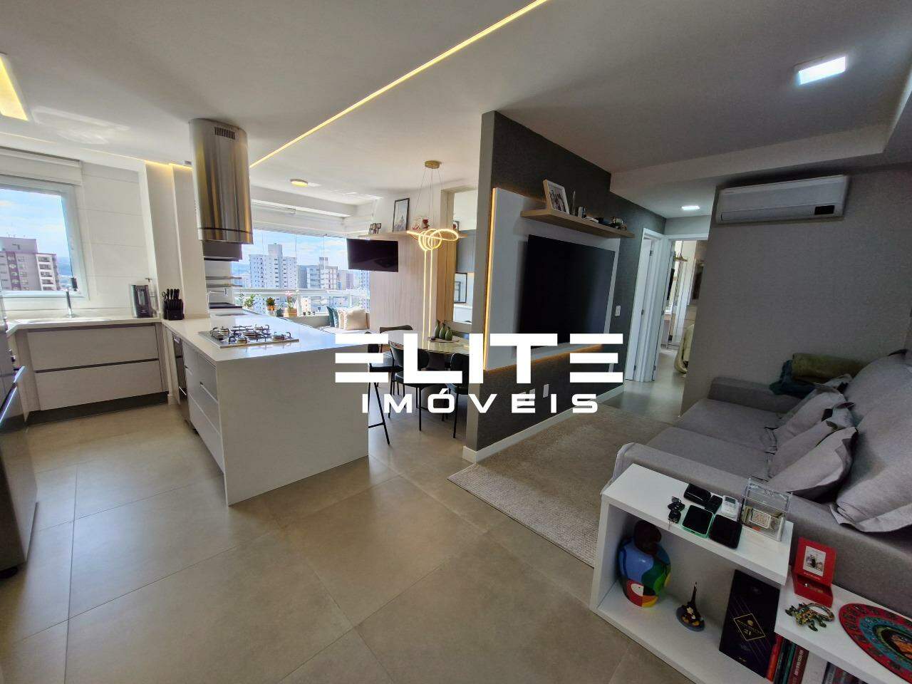 Sala integrada à cozinha e ao espaço gourmet, também com ar condicionado