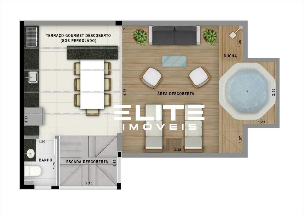 Terraço gourmet descoberto no piso superior, com ponto de ducha e espaço para jacuzzi