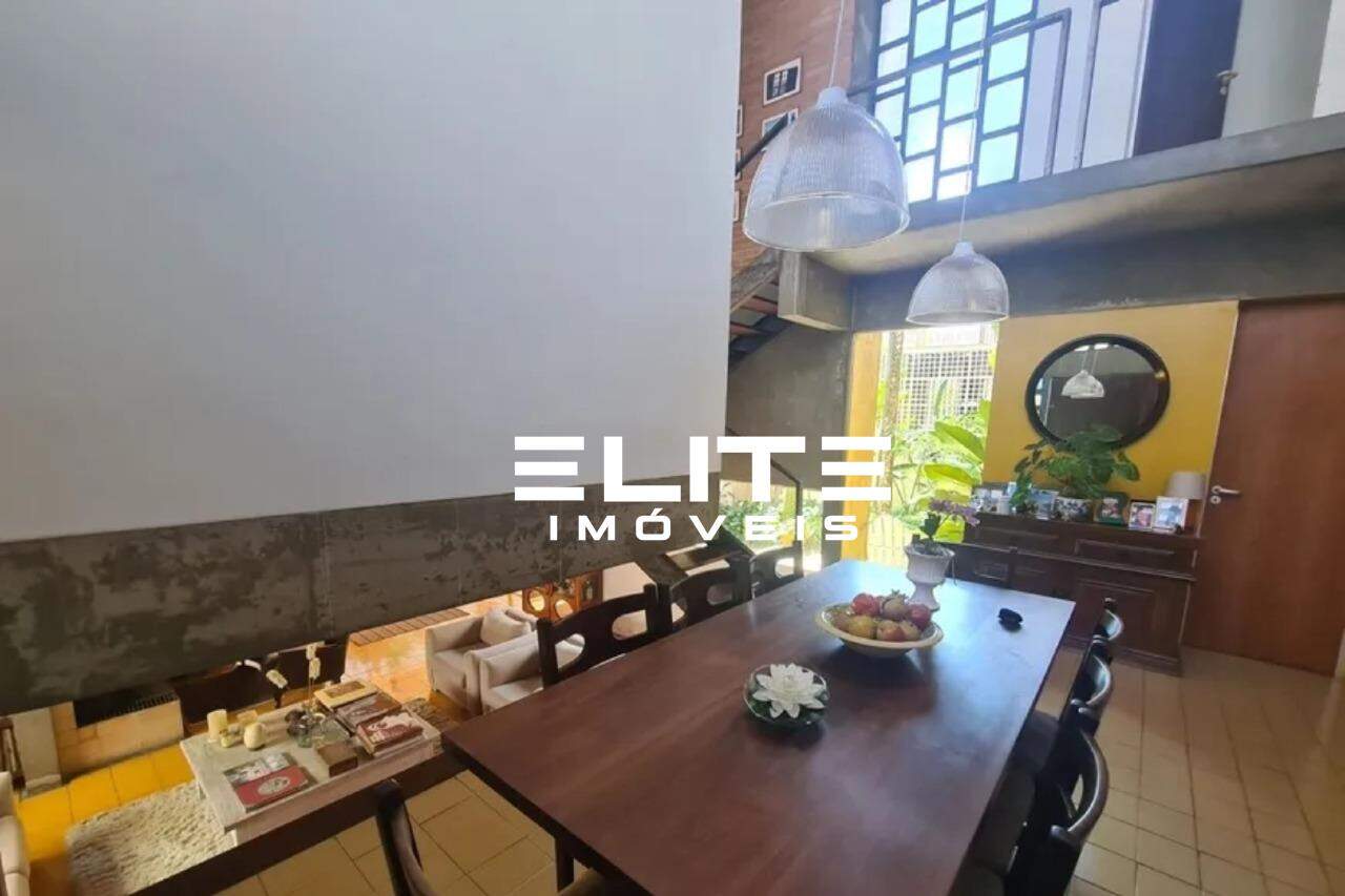 O pé-direito de 11 metros na sala de jantar é um dos grandes destaques, valorizando a iluminação natural e criando uma sensação de amplitude e leveza.
