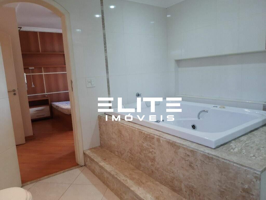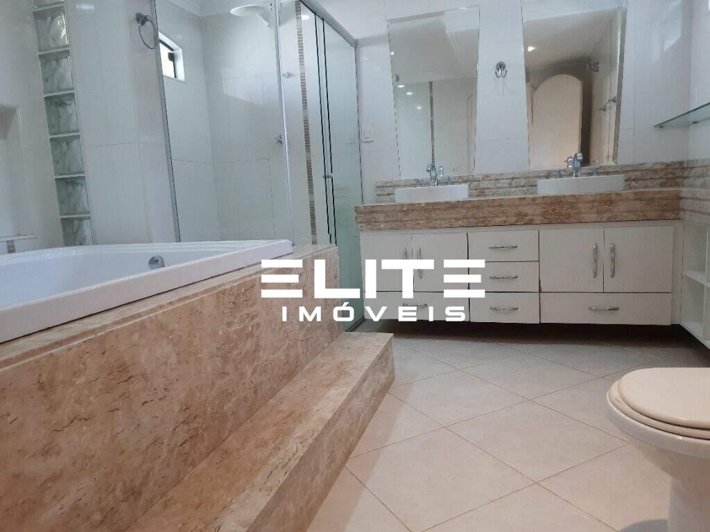 Suíte master muito espaçosa, com closet planejado, sacada e banheiro completo com banheira de hidromassagem dupla, cubas duplas, porcelanato e box de vidro